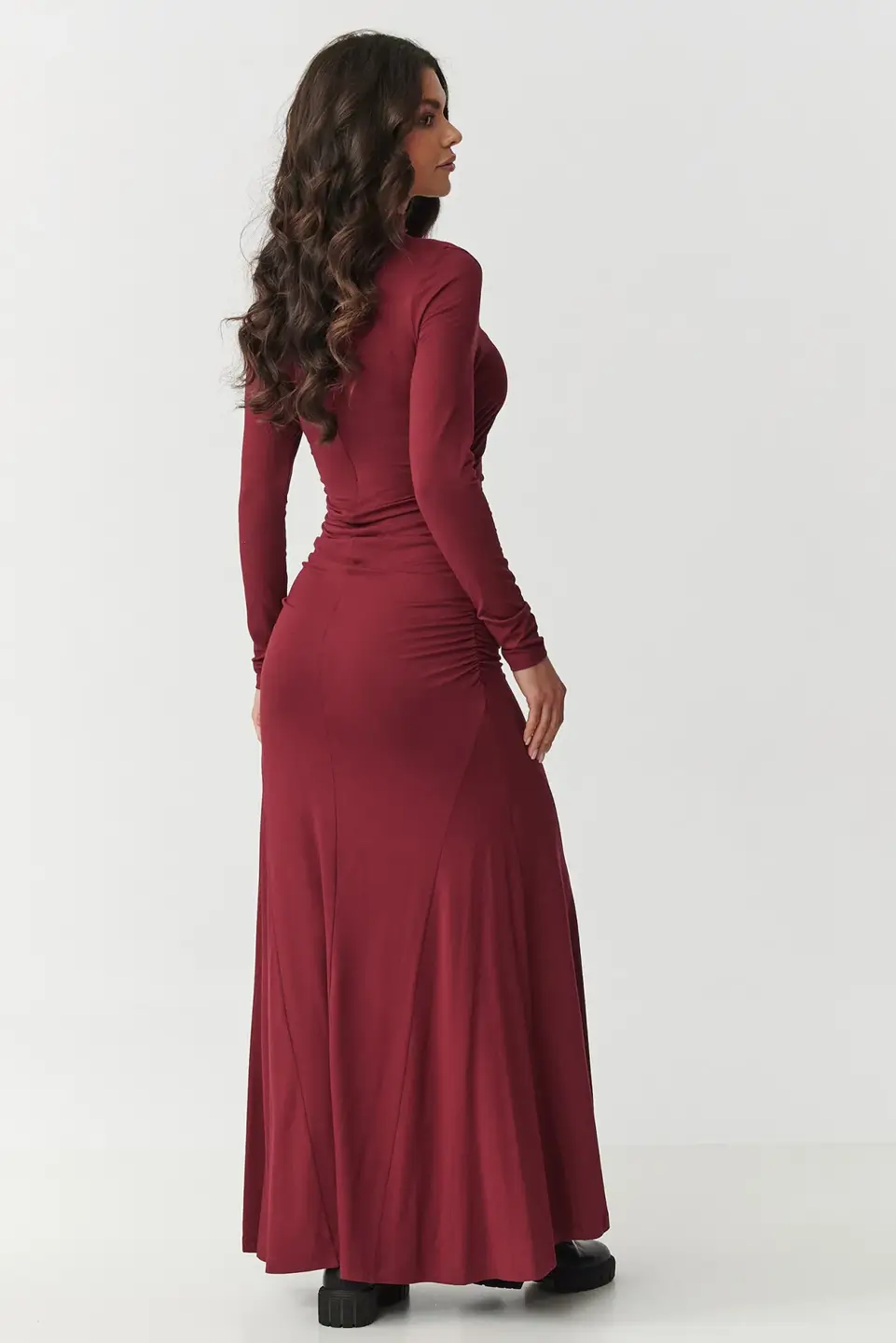 Subtelne marszczenia w talii optycznie wysmuklają sylwetkę, podkreślając jej proporcje. Długość maxi oraz delikatnie rozkloszowany dół nadają lekkości, a jednocześnie zapewniają wygodę na najwyższym poziomie.