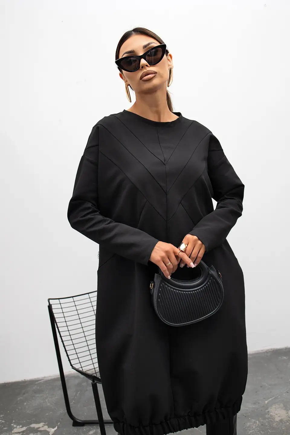 Model wyróżnia się luźnym, komfortowym krojem oraz geometrycznymi przeszyciami, które subtelnie modelują sylwetkę. To sukienka, która nie potrzebuje wielu dodatków – jej forma sama gra pierwsze skrzypce.